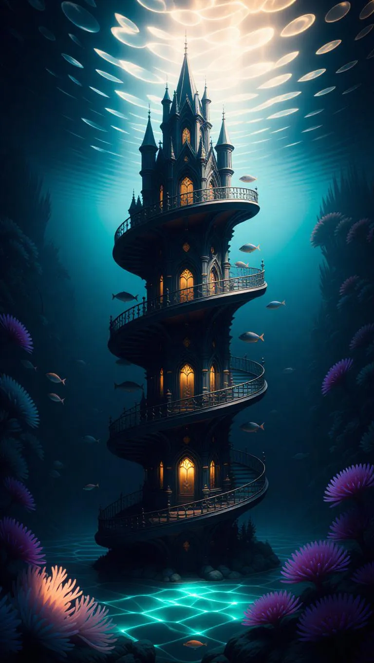 A fantastical underwater chateau spiraling upward, bathed in shimmering surface light, flowing lines, otherworldly atmosphere, surrounded by soft currents and radiant water, with bioluminescent fish and flickering fire-corals adding a magical glow.