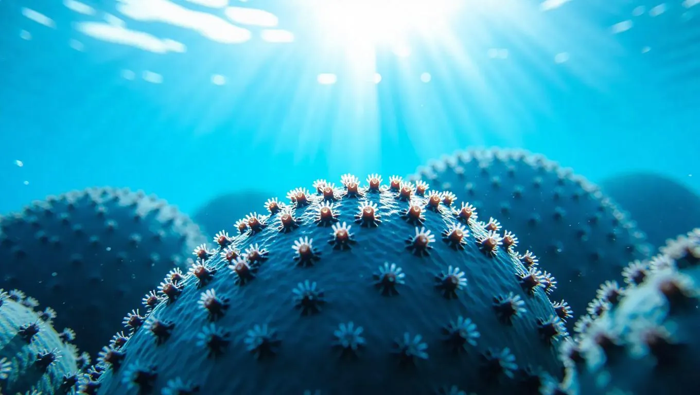 Underwater photography style, intimate close-up of underwater rocks with barnacles, capturing their rough surfaces and the play of light on them, surrounded by a serene blue backdrop, with subtle light rays piercing through, enhancing the ethereal atmosphere.