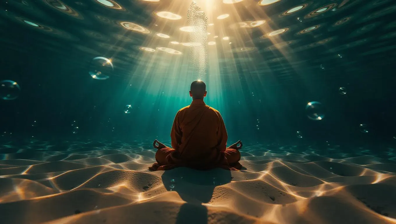 6. An ethereal underwater meditation scene with a serene monk seated cross-legged on a sandy bottom, surrounded by shimmering bubbles and radiant light rays piercing through the water, creating a tranquil and mystical atmosphere.