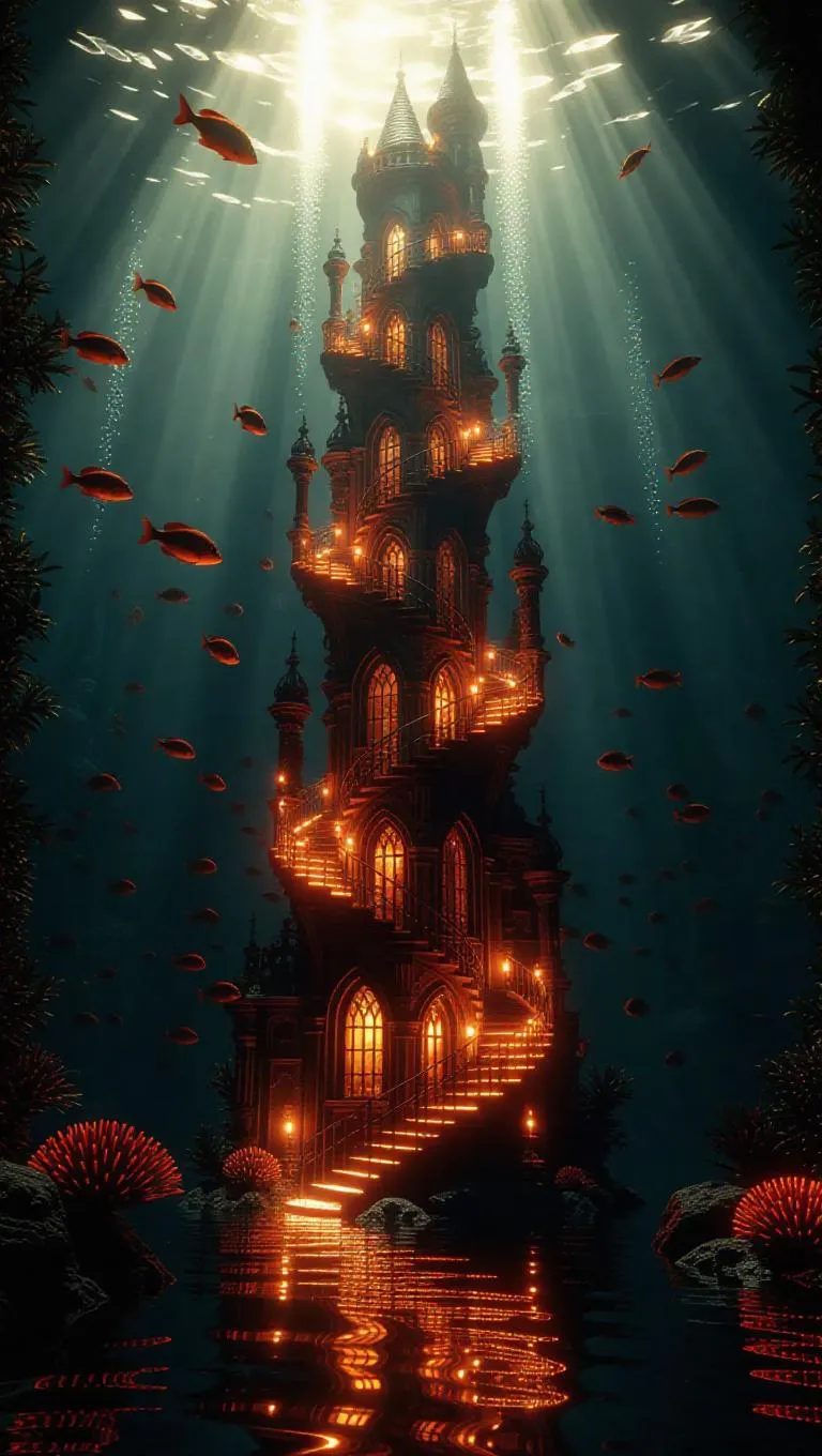 A striking underwater chateau spiraling upward, lit by warm surface light, angular lines, surreal atmosphere, surrounded by calming currents and shining water, with bioluminescent fish and flickering fire-like corals adding a magical glow.