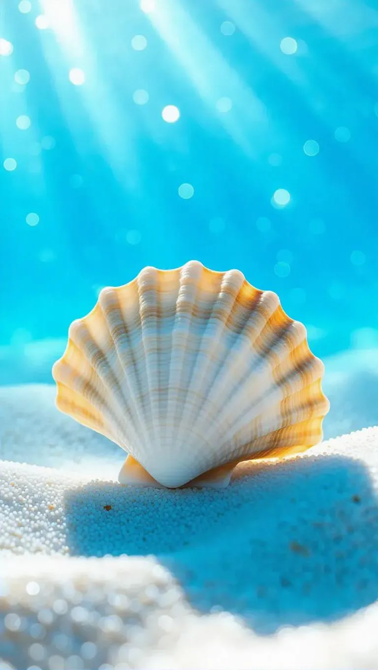 Underwater photography style, intimate close-up of a beautiful seashell resting on the ocean floor, capturing its intricate patterns and colors, surrounded by a serene blue backdrop, with subtle light rays piercing through, enhancing the ethereal atmosphere.