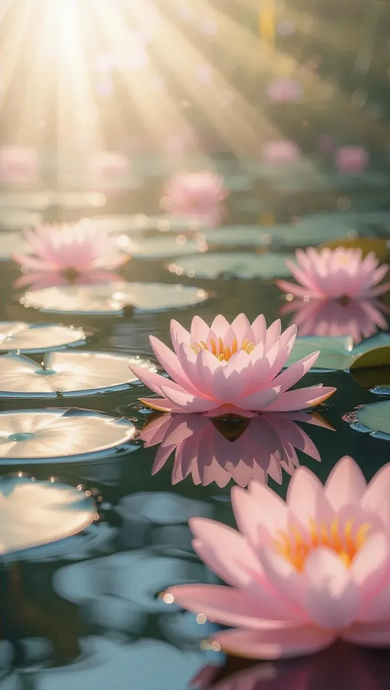 19. Soft-focus dreamy underwater scene of water lilies floating on the surface, pastel colors, gentle ripples, ethereal light beams, and a serene, tranquil atmosphere.