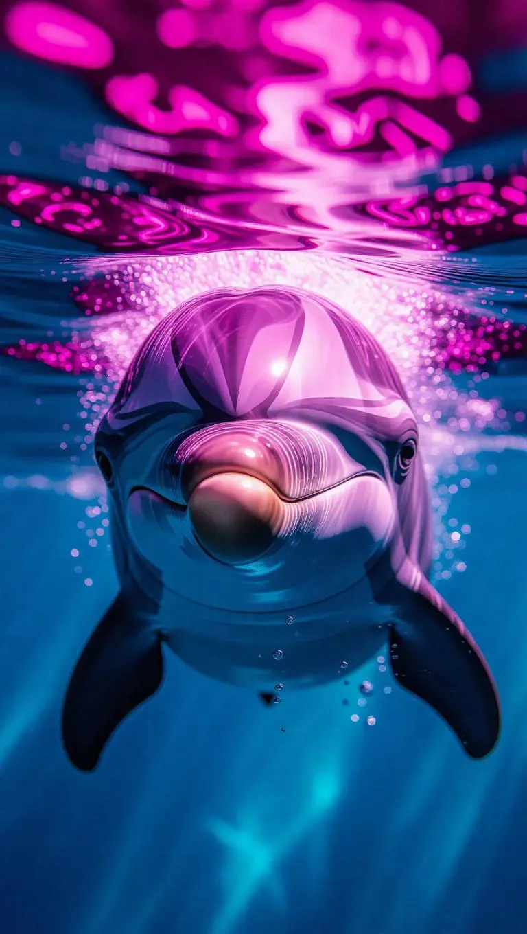 Cinematic close-up of a dolphin's snout hovering before a gleaming lapis lazuli, dramatic shadows cast by ethereal magenta light, bubbles swirling around, vibrant underwater shadows adding depth and texture.