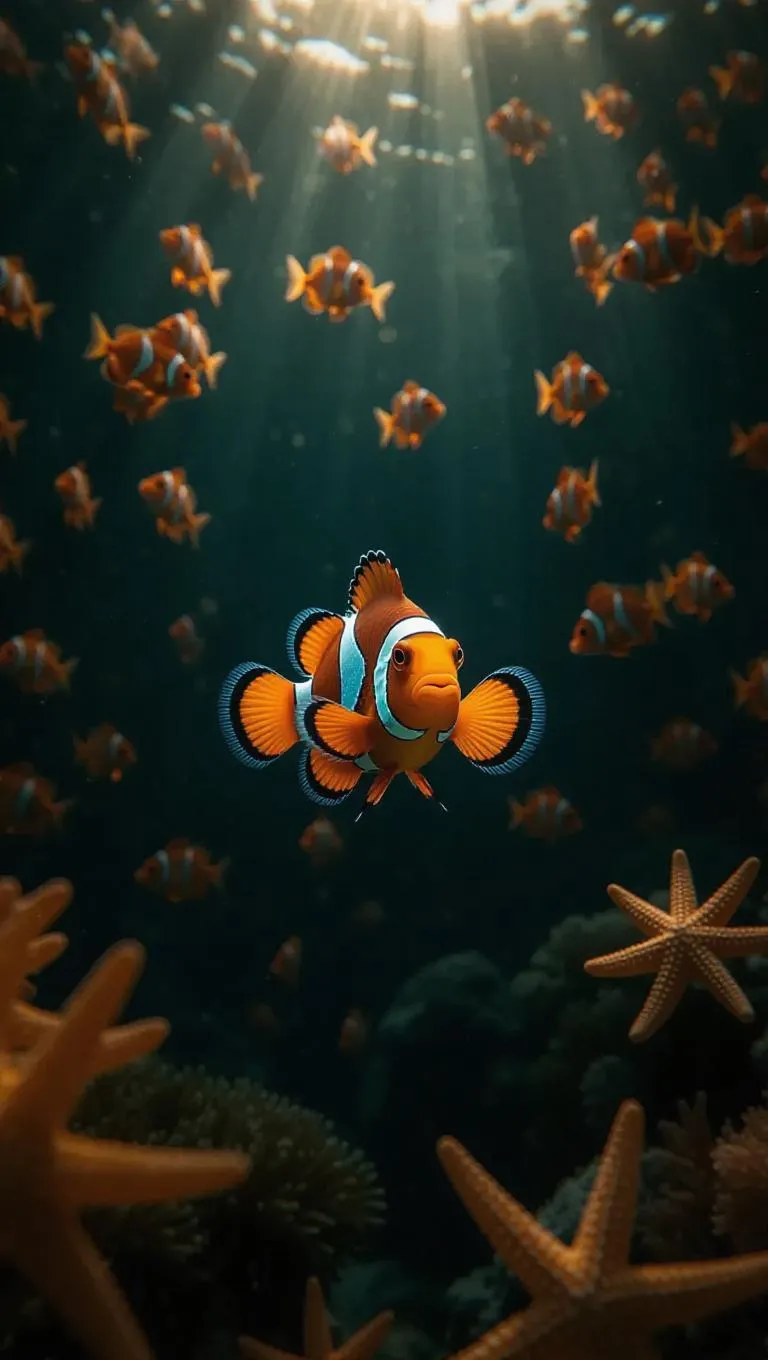 9. Underwater scene, a single clownfish animatedly centered in deep emerald waters, surrounded by a school of darting fish, soft gradients transitioning from dark to light, clean and elegant lines, ethereal glow, gentle currents, starfish in the background, sunlight filtering through the surface.