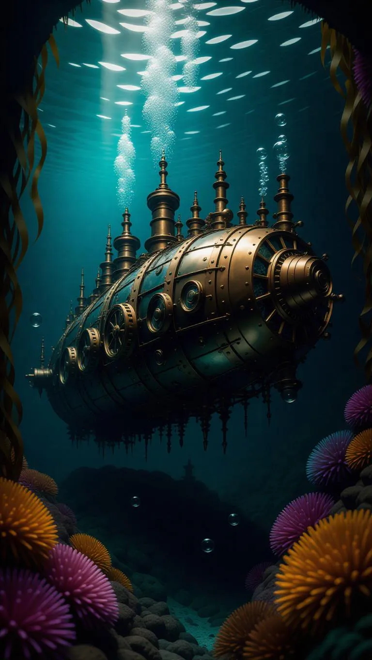 Dutch angle shot of a Victorian submarine exploring coral-encrusted steampunk ruins, brass gears rotating amidst kelp forests, air bubbles rising from copper rivets, oil-painting style with patina effect, ethereal underwater lighting, intricate mechanical details, vibrant marine life.