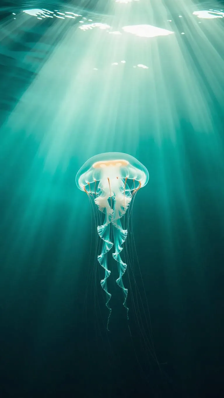Minimalist underwater scene, a single jellyfish gracefully centered in light teal waters, soft gradients transitioning from dark to light, clean and elegant lines, ethereal glow.