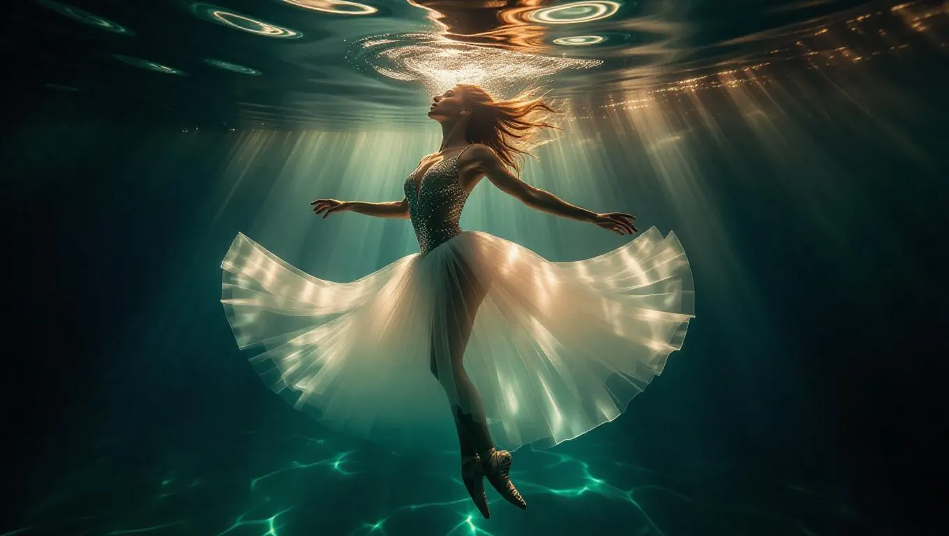 Surreal underwater ballet dancer, composed of shimmering water and radiant light, gracefully gliding through a shadowy, teal sea, surrounded by swirling shadows, creating a mesmerizing dance of colors and motion.