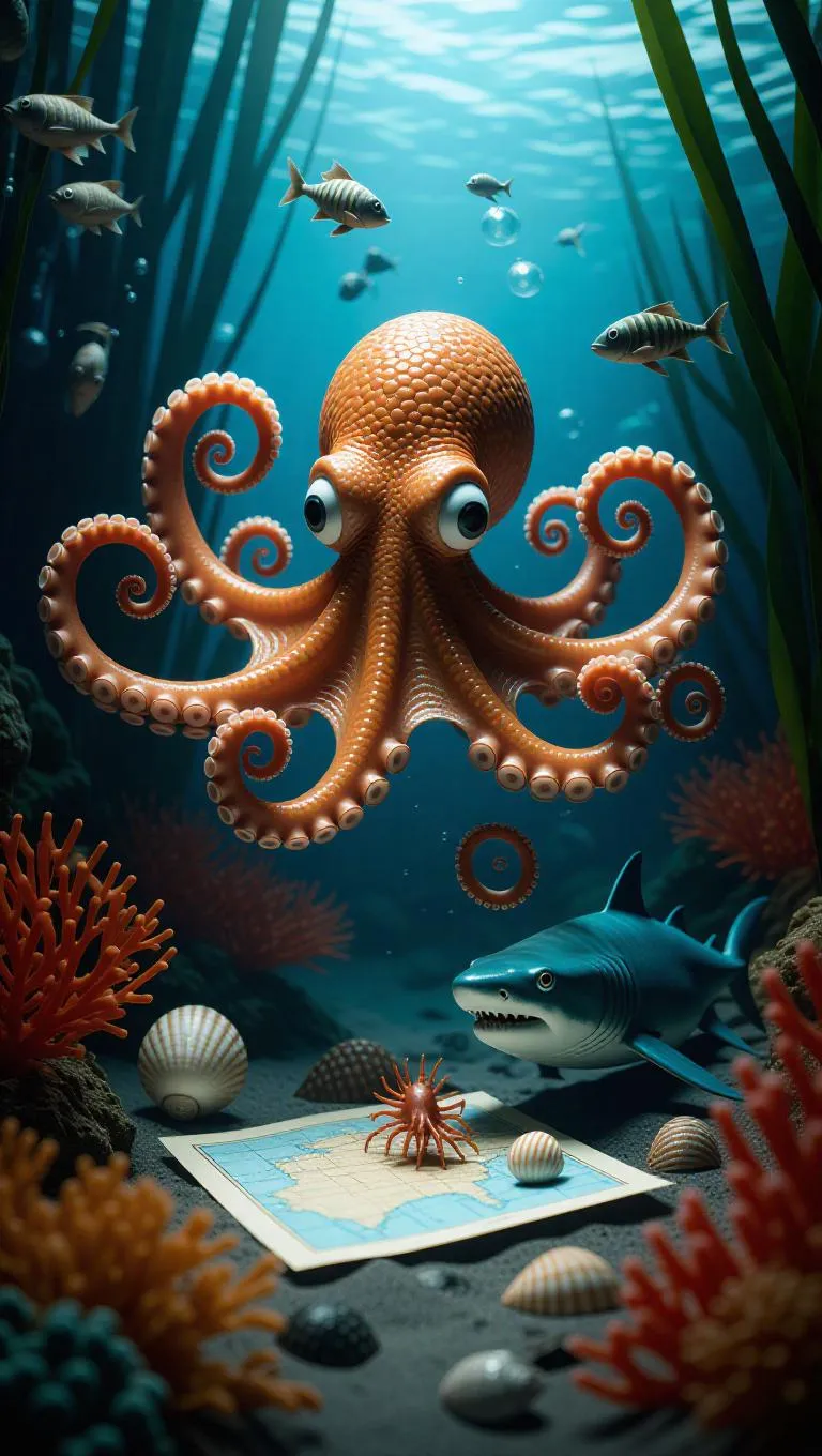 A mysterious underwater detective scene, a sly octopus investigates a missing pearl case, interrogating a wary shark and a nervous shrimp. Clues like broken shells and a damaged map are scattered among vibrant coral and undulating seaweed, creating a suspenseful and intriguing atmosphere.