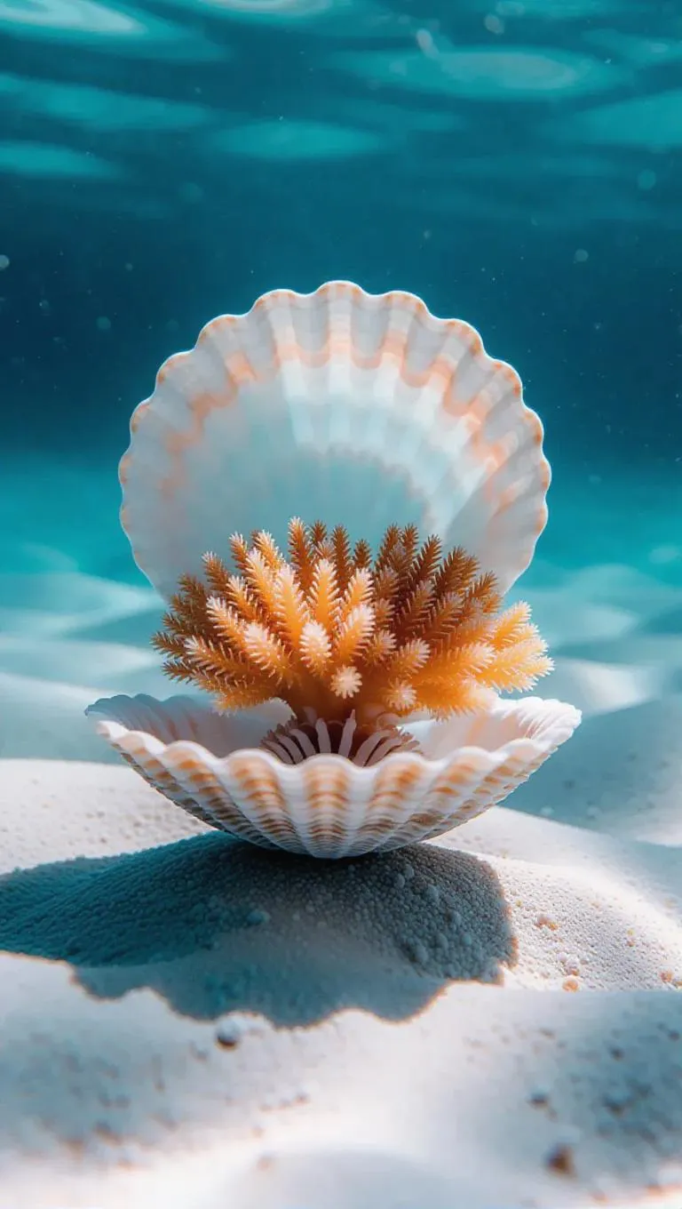 Minimalist underwater scene of a vibrant coral nestled in an open clam, surrounded by perfect symmetry and soft, ethereal light reflections, creating a serene and tranquil ambiance.
