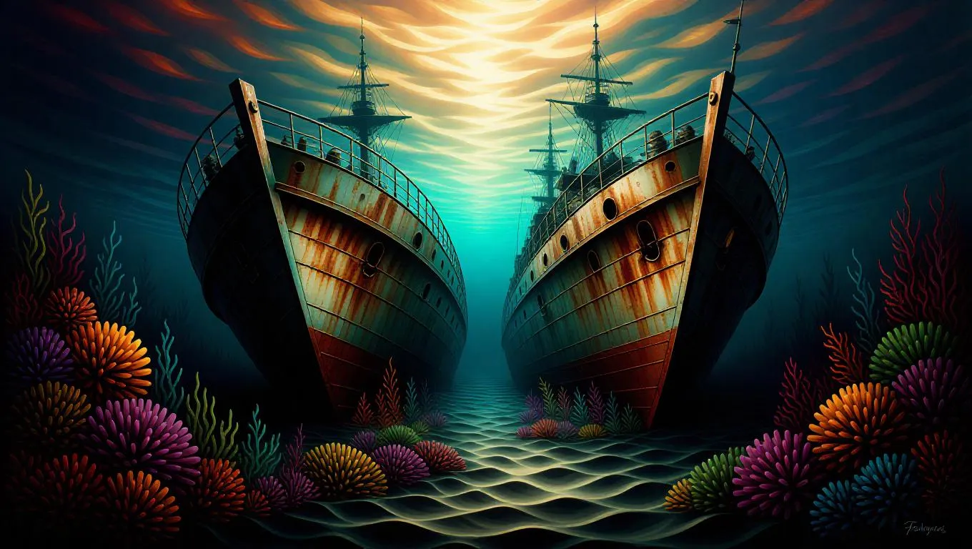Oil painting of a shipwreck split in two, illuminated by colorful underwater plants, rich textures, dramatic shadows, and swirling underwater currents, creating a hauntingly beautiful scene.