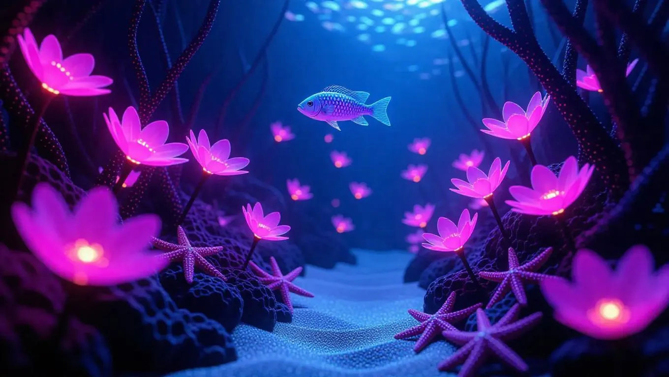 A whimsical underwater garden with radiant pink flowers, roots entangled with starfish patterns, softly glowing parrotfish gliding gracefully, bioluminescent shimmer surrounding the scene, creating a vibrant, dreamlike atmosphere.