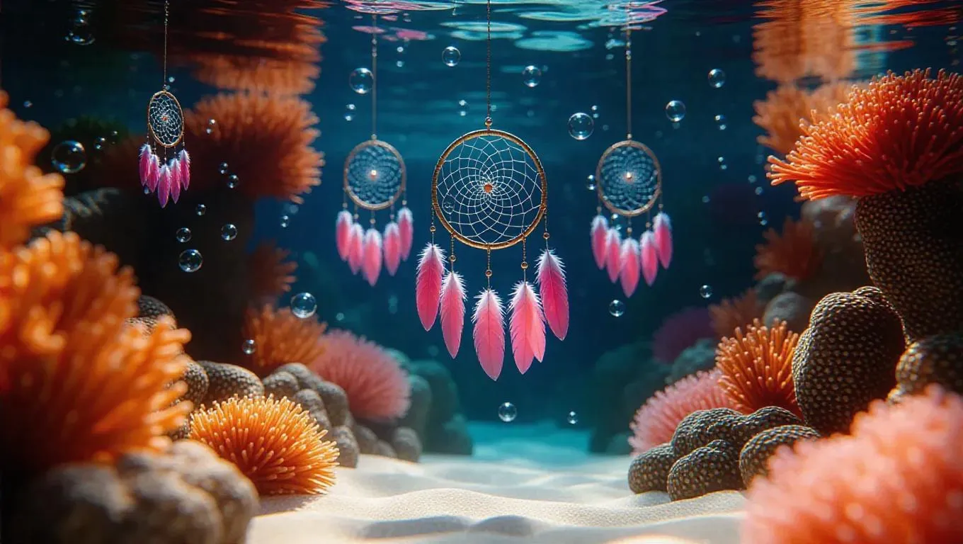 Surreal underwater garden party, floating dreamcatchers and iridescent feathers, dreamlike colors, weightless atmosphere, ethereal bubbles, soft glowing lights, vibrant coral backdrop, serene and whimsical, surrounded by gentle sea currents, sleek eels weaving through.