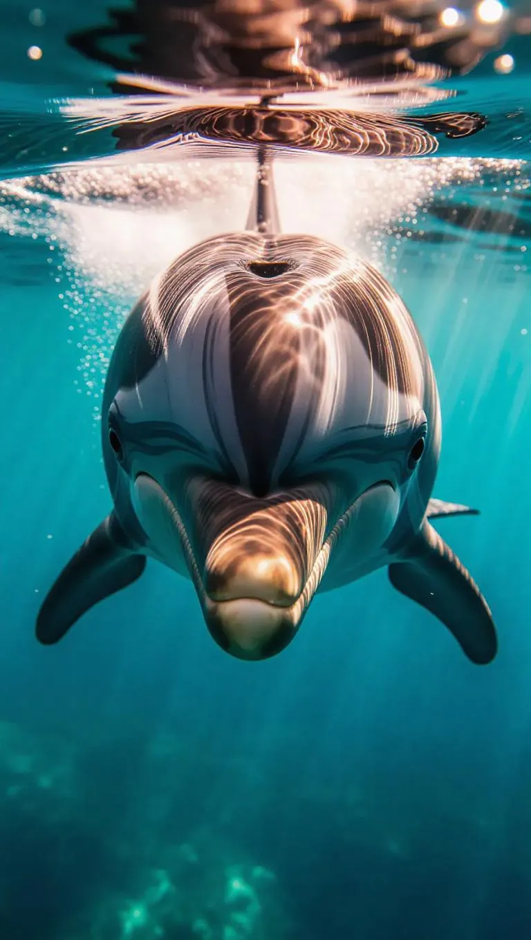 Cinematic close-up of a dolphin's snout softly touching a radiant turquoise, dramatic shadows cast by ethereal yellow light, bubbles swirling around, vibrant underwater creatures adding depth and texture.