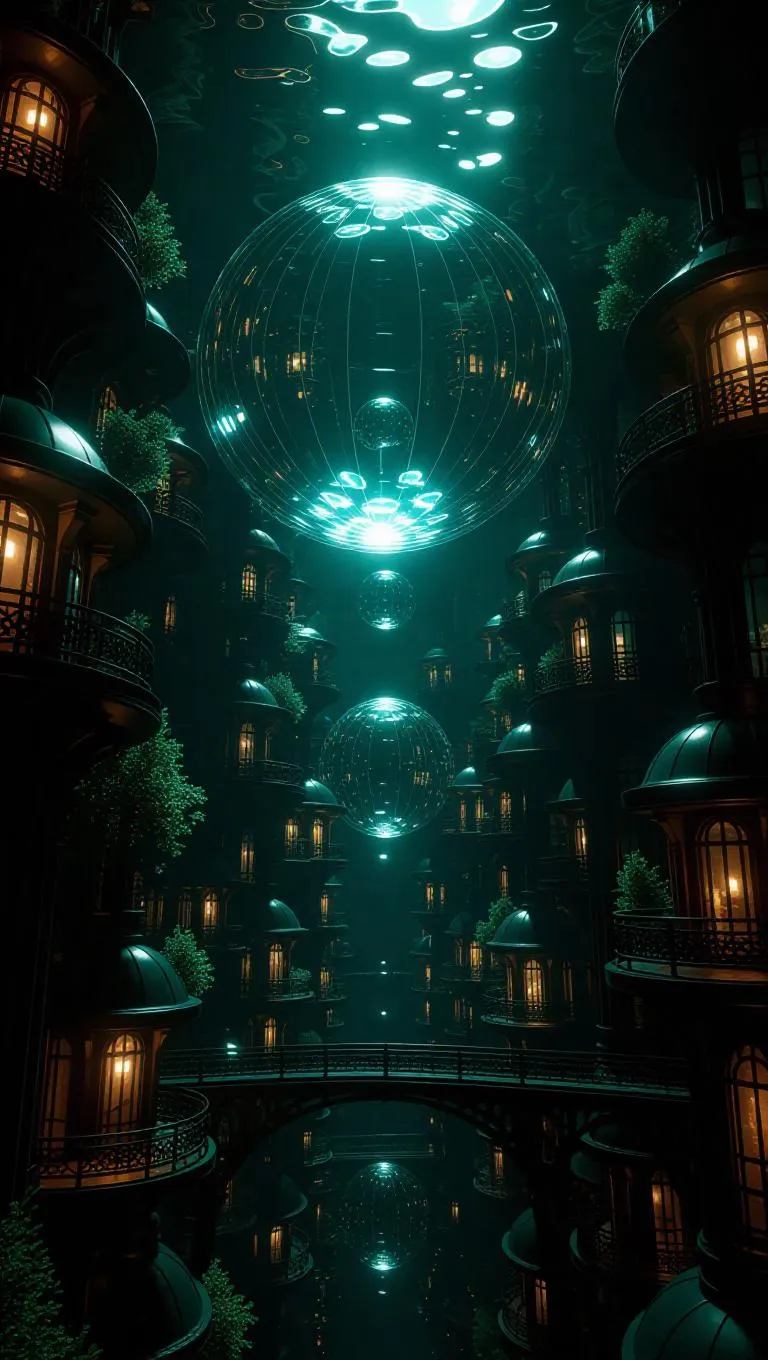 Anamorphic view of quantum entanglement bubbles in an underwater city, holographic data streams weaving through submerged buildings, urban anglerfish with intricate LED lure patterns, chromatic aberration enhancing architectural details, ethereal glow illuminating the forgotten metropolis.