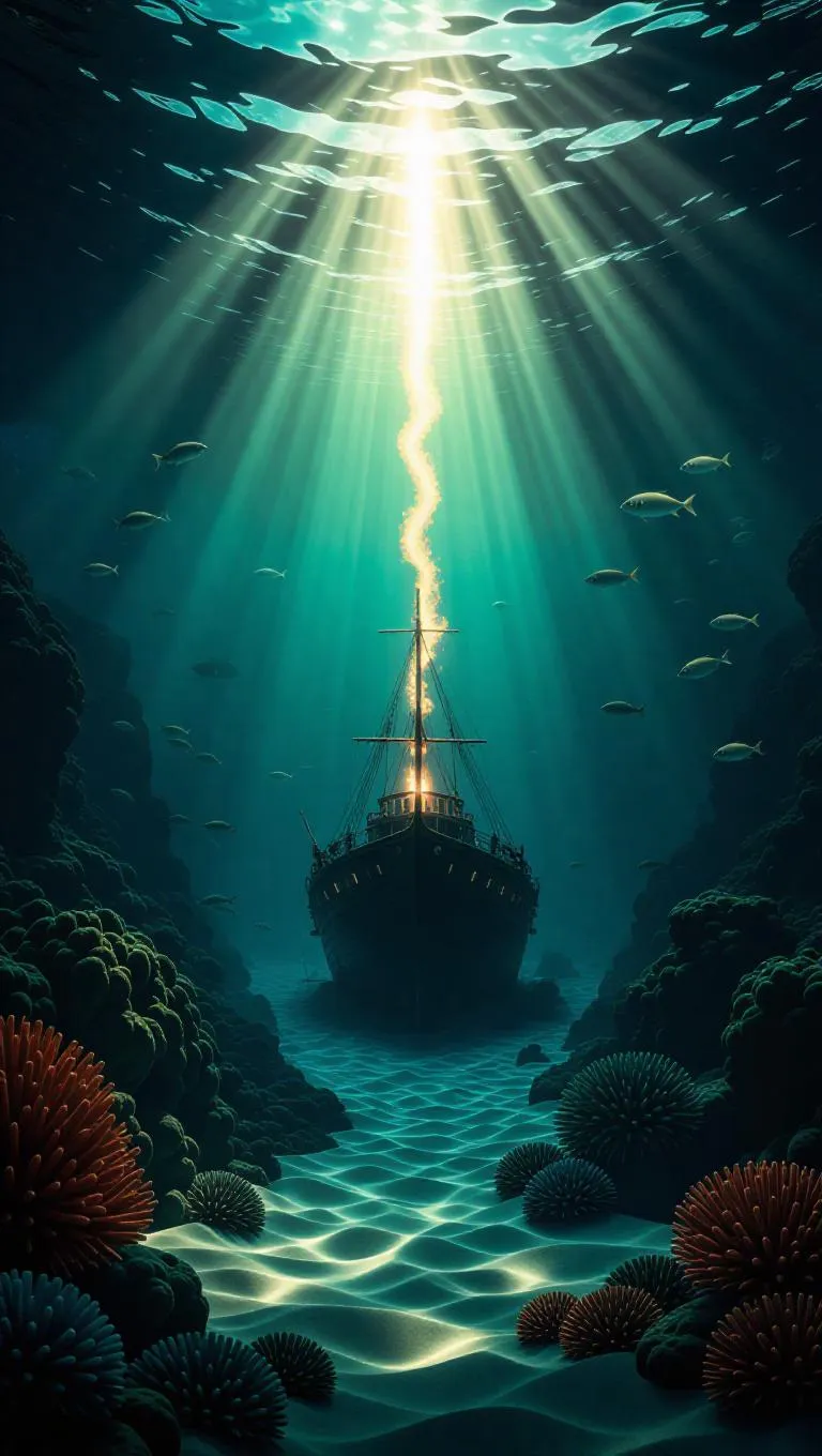 Time begins. The light side is now clear, calm and glowing—a divine Day. The dark side is clear, cool and deep—a sacred Night. There is a sense of rhythm, as if Day and Night begin their eternal cycle. No sun or moon exists yet. The warm golden-white glow radiance, representing God, remains above, watching over creation. The scene is peaceful, full of divine wonder. Pixar style, children-friendly, glowing golden-white light, soft shadows, ocean surface, dark void, magical, divine atmosphere, harmony, beginning of creation, visual storytelling, consistent colors, gentle gradients, still water, awe-inspiring, child-safe