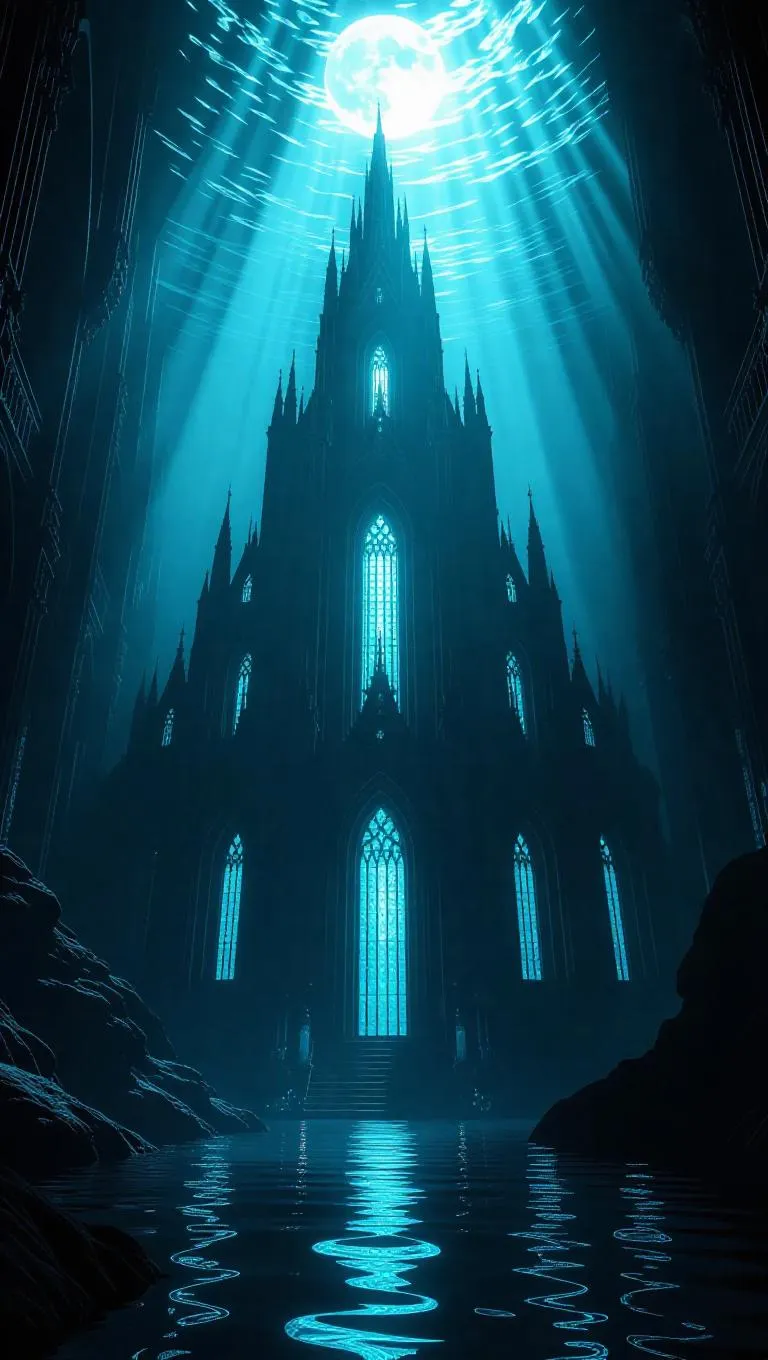 A futuristic scene underwater, with submerged cathedrals and advanced technology, rays of moonlight filtering through, creating a mesmerizing play of light and shadow, spiritual lighting, highly detailed, surrounded by ethereal sea sprites.