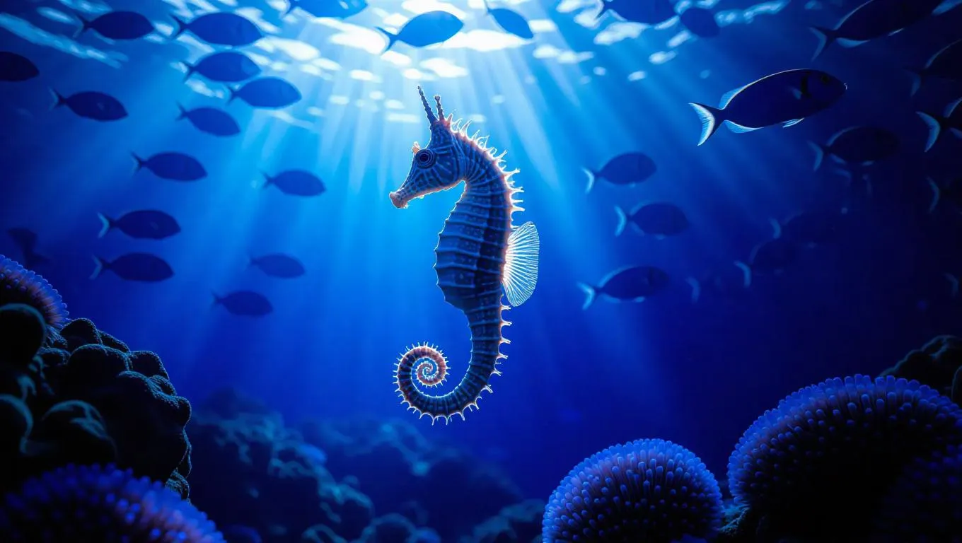 4. Underwater scene, a single sea horse delicately centered in deep cobalt waters, surrounded by a school of lively fish, soft gradients transitioning from dark to light, clean and elegant lines, ethereal glow, gentle currents, anemones in the background, sunlight filtering through the surface.