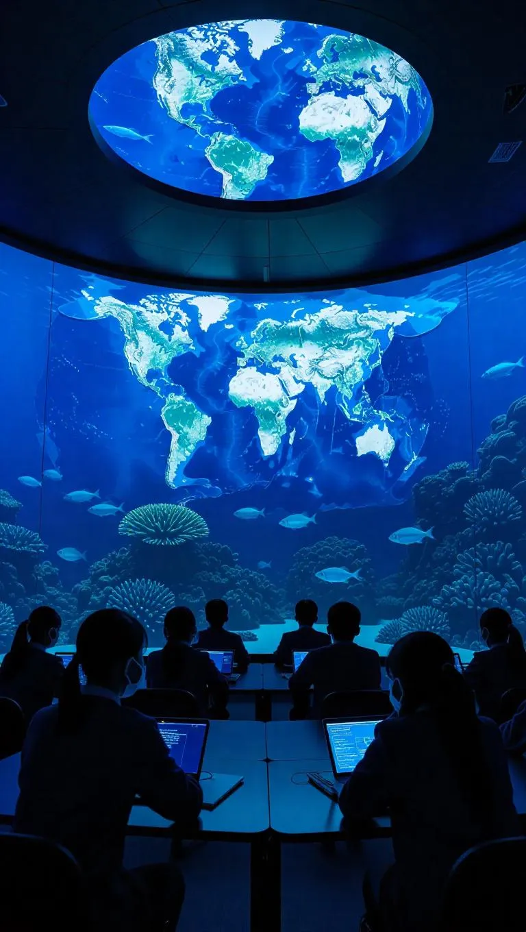 Futuristic underwater dome classroom, holographic screens vividly projecting geography facts, AI jellyfish tutors glowing softly with continental knowledge, students wearing breathable masks diligently taking notes, surrounded by oceanic landscapes and marine creatures.