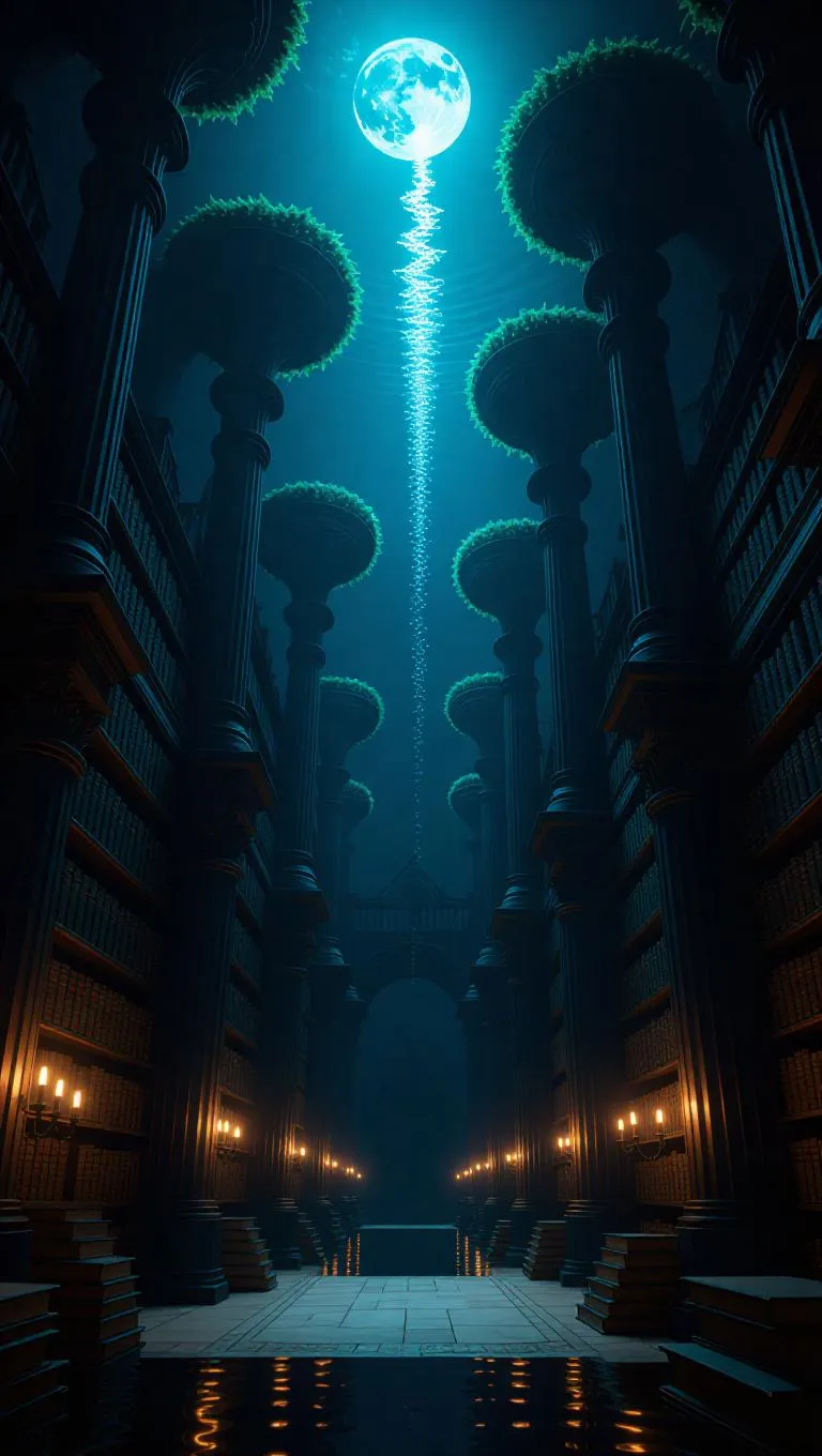 A grand underwater library with twisted columns of kelp, where books lazily rise and fall with the tide. Mellow moonlight filters from above, creating dreamy shadows on quiet merfolk scholars.