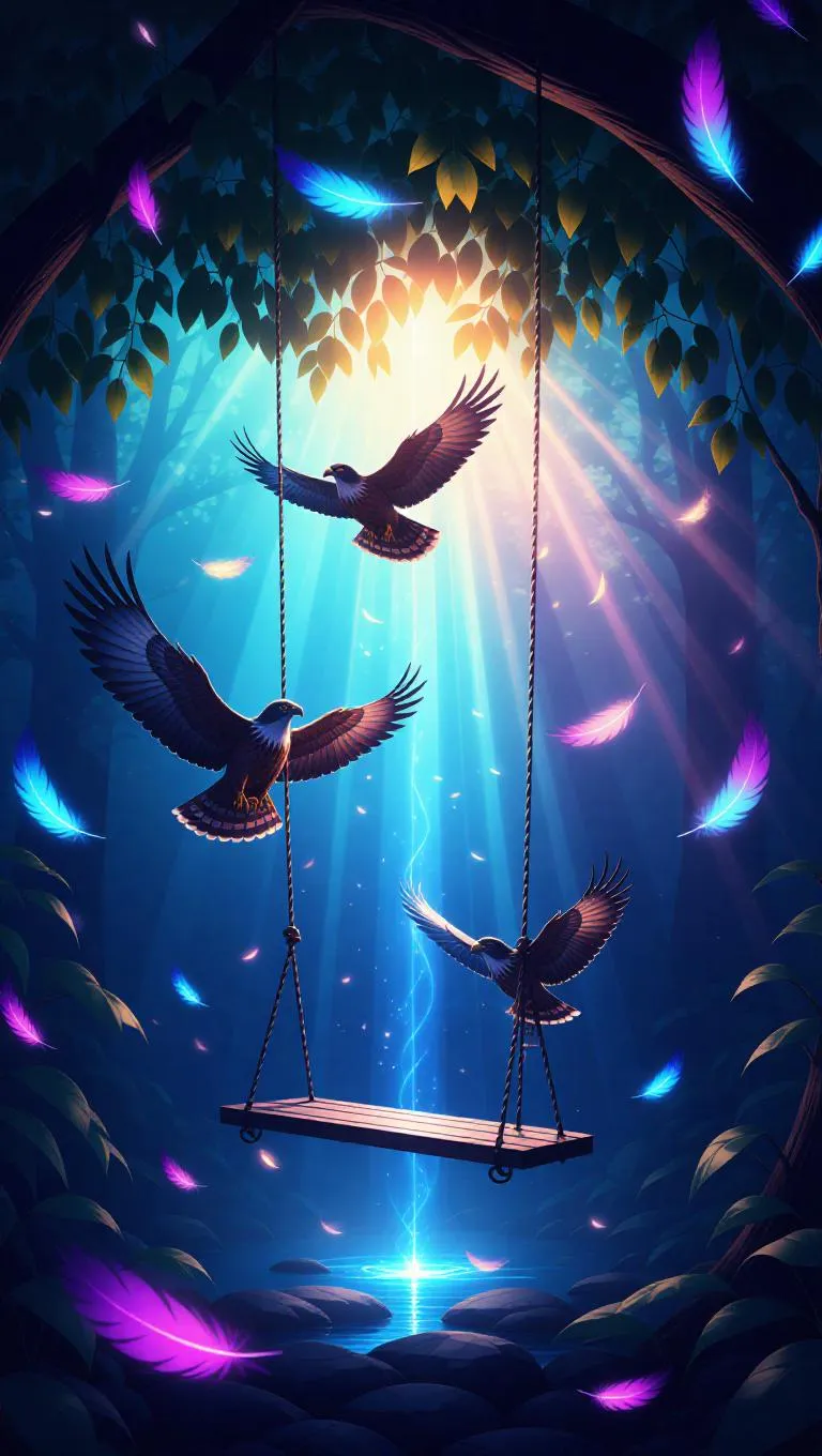 Soft-focused fantasy scene, a swing hanging from a giant breeze, glowing feathers drifting through the air, ethereal light beams piercing through the atmosphere, creating a magical ambiance, vibrant hawks circling around.