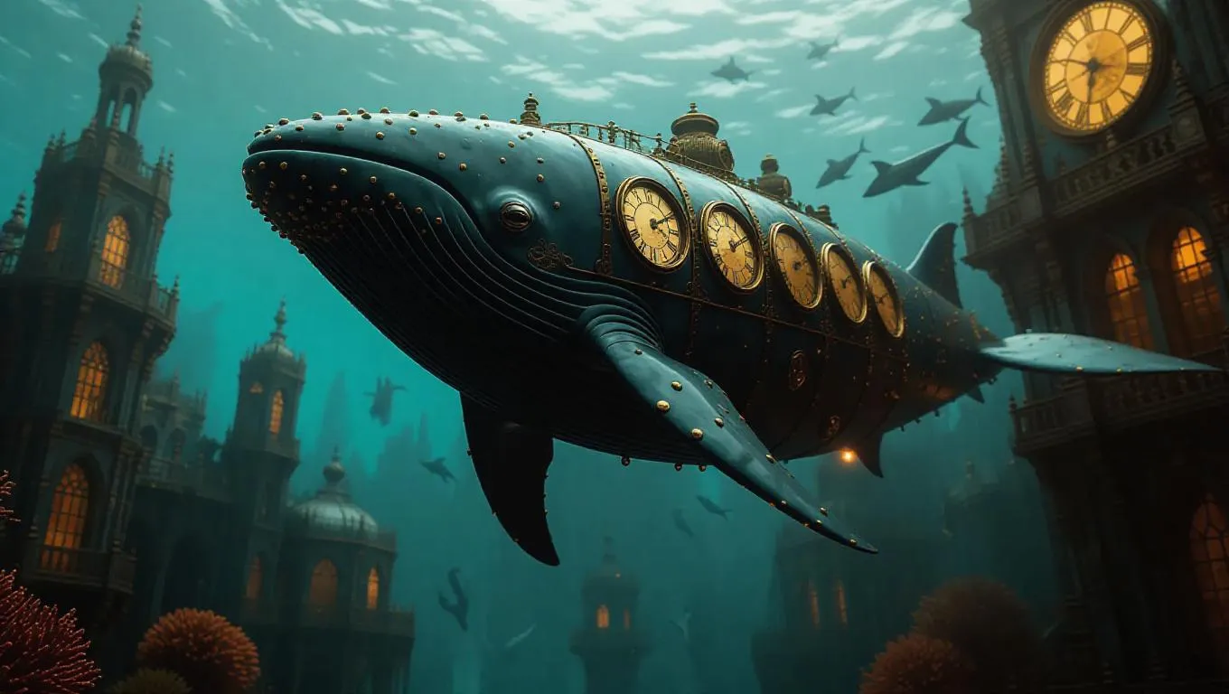 Steampunk whale-bus soaring above neo-gothic coral ruins, dolphin conductors meticulously timing brass watches, split windows displaying waves of pixelated krill, dramatic style with high contrast, intense mood