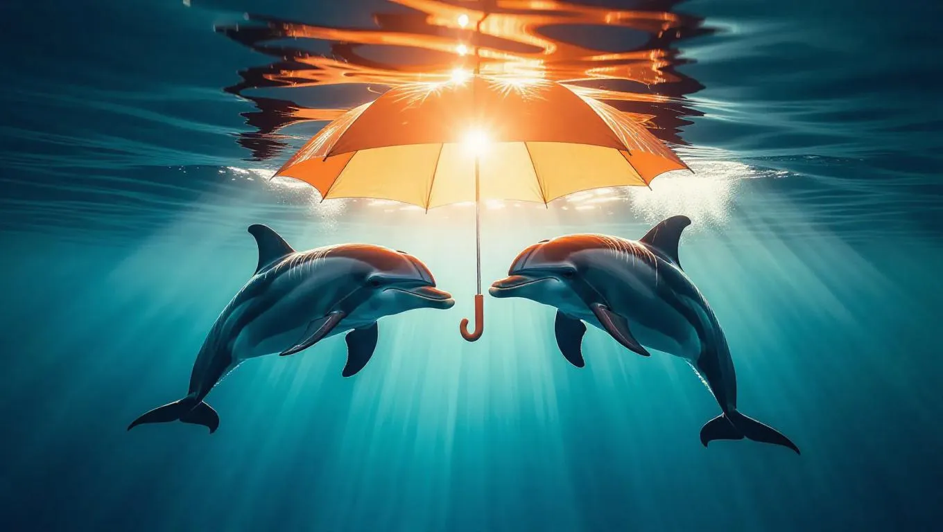 A glowing umbrella gently drifting underwater, surrounded by two dolphins dancing playfully, creating an uplifting and joyful mood, with a bright, radiant light highlighting their joyous expressions.