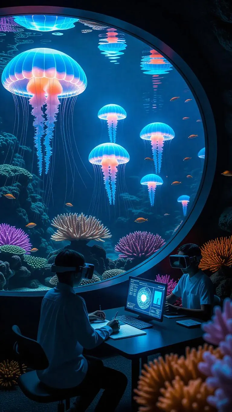 Futuristic underwater dome classroom, holographic screens vividly projecting computer science principles, AI jellyfish tutors glowing softly with algorithm explanations, students wearing futuristic masks methodically taking notes, surrounded by vibrant coral reefs and underwater life.