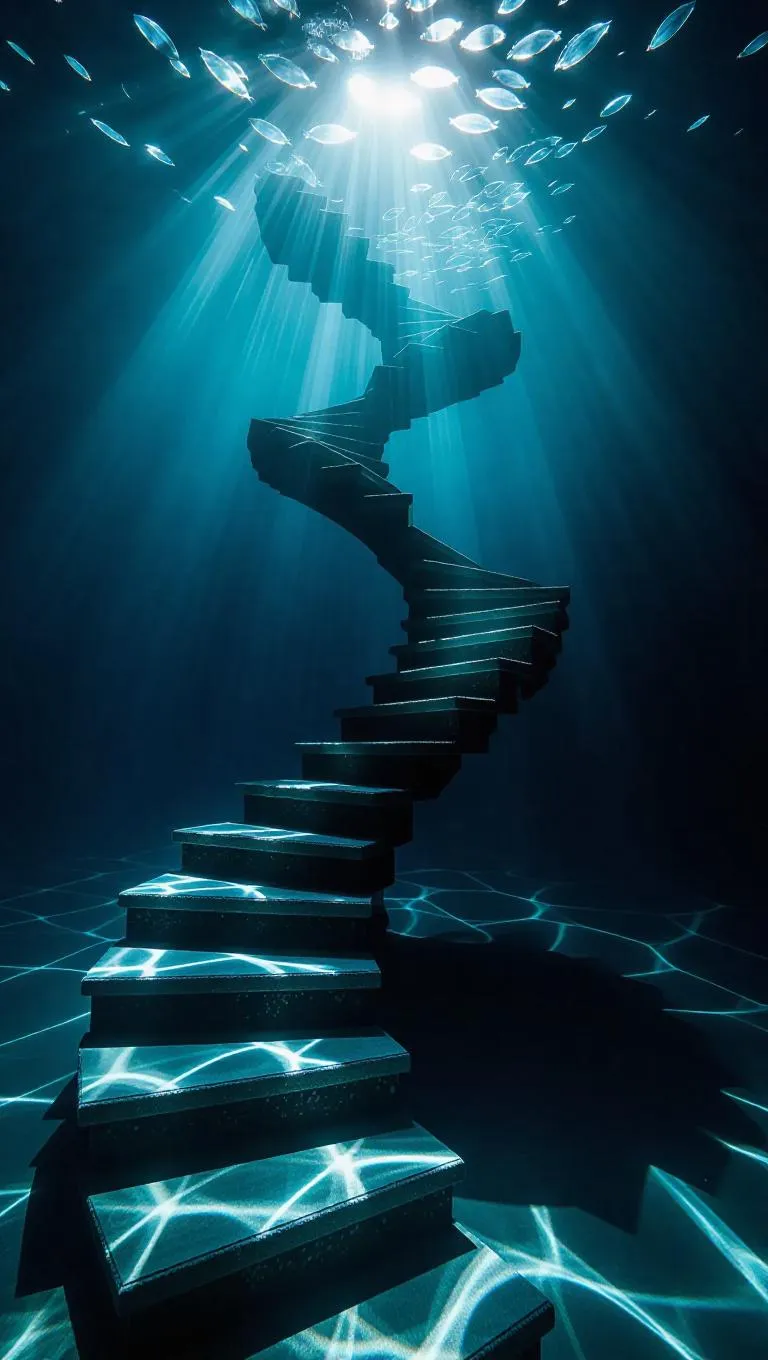 A mystical underwater staircase spiraling upward, wrapped in gentle twilight, clear lines, calming atmosphere, surrounded by drifting currents and shimmering water.