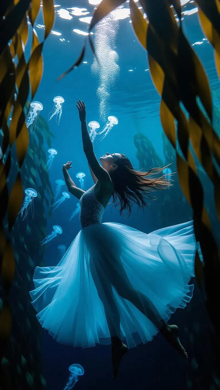 An underwater artist performs a mesmerizing routine in a vibrant kelp forest, their elegant movements synchronized with the moving seaweed. Jellyfish emit soft, bioluminescent glows in the background, enhancing the enchanting and magical atmosphere.