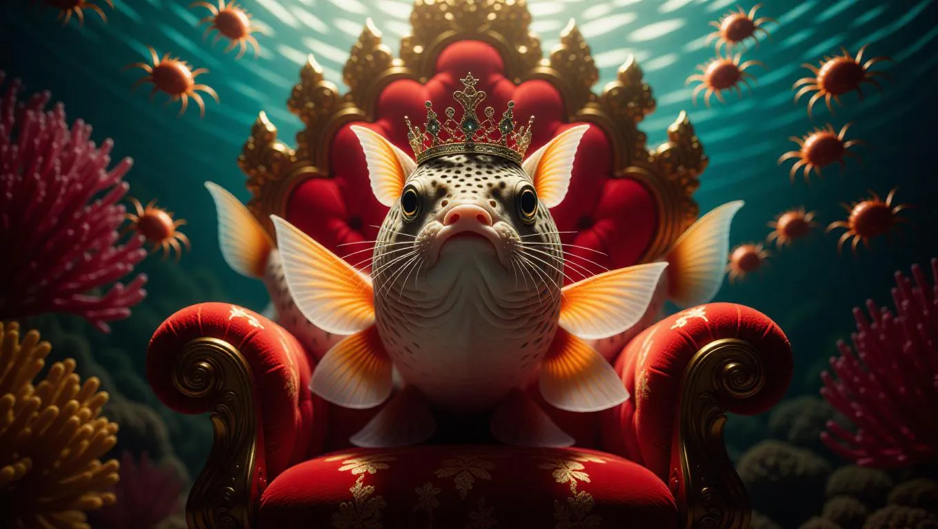 A graceful mystical catfish wearing a delicate crown, perched comfortably on a flamboyant coral throne, amidst a circulation of tiny, glowing crab-like creatures, situated in a vibrant underwater fantasy environment, with ripple-like water and enchanting light.