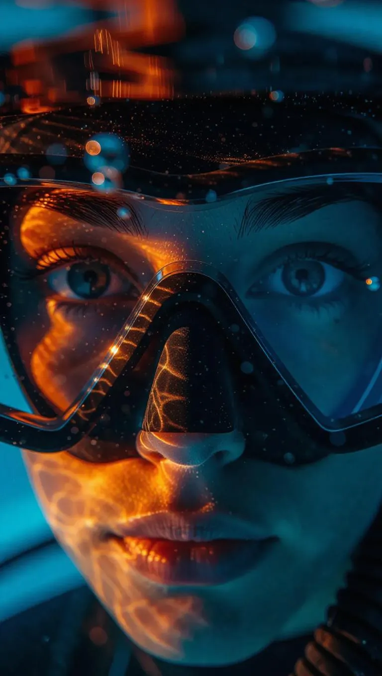 Underwater photography style, intimate close-up of a diver’s face shield reflecting the underwater scene, capturing the distorted reflections and colors, surrounded by a serene blue backdrop, with subtle light rays piercing through, enhancing the ethereal atmosphere.