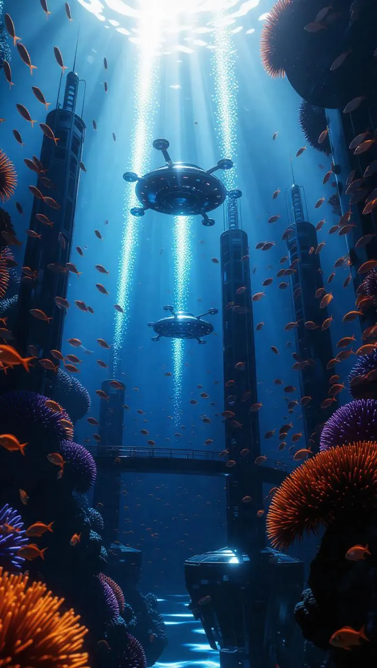 A futuristic human life scene underwater, featuring submerged defense systems and security drones, flames weaving through the coral, rays of sunlight piercing through the water, creating a protective play of light and shadow, cinematic lighting, highly detailed, surrounded by swirling schools of vigilant fish, vibrant coral reefs, and sleek, modern architecture.