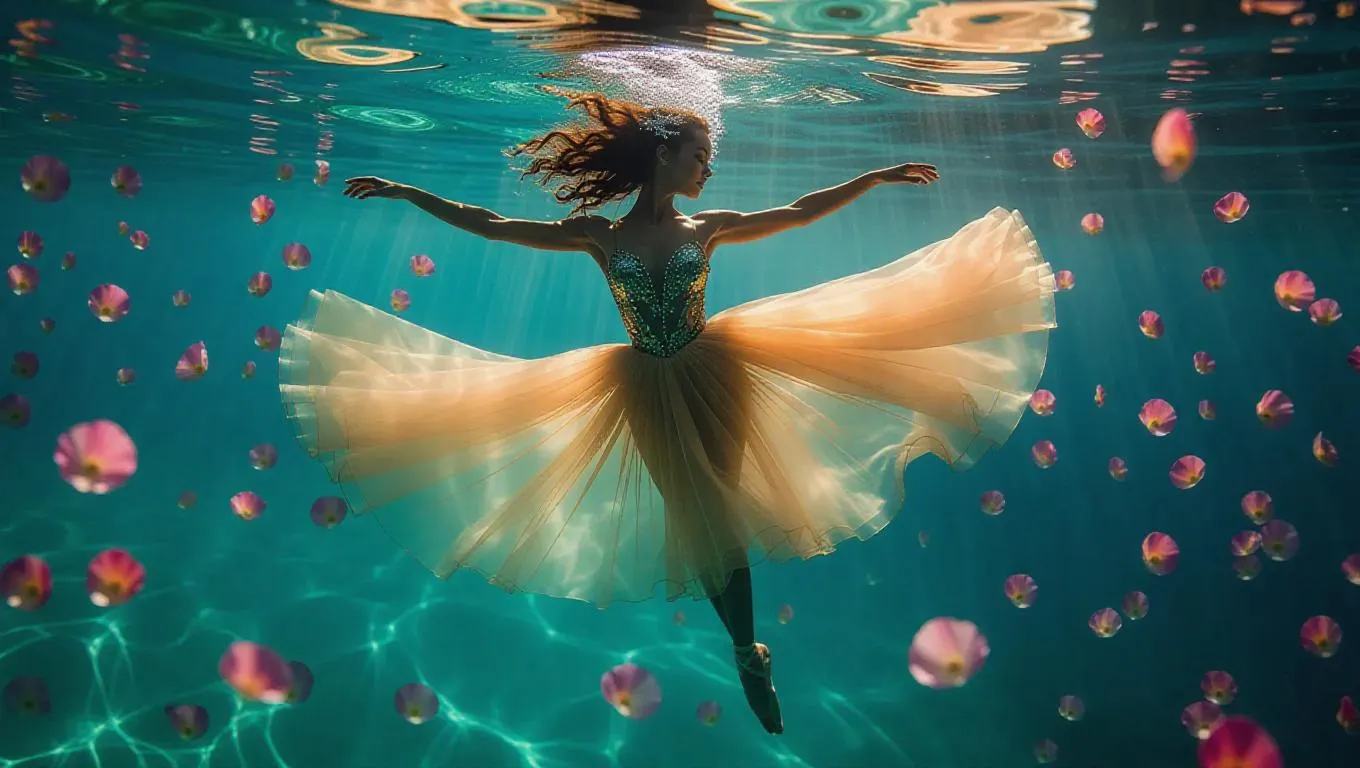 Surreal underwater ballet dancer, composed of shimmering water and radiant light, gracefully gliding through a calm, turquoise sea, surrounded by floating petals, creating a mesmerizing dance of colors and motion.