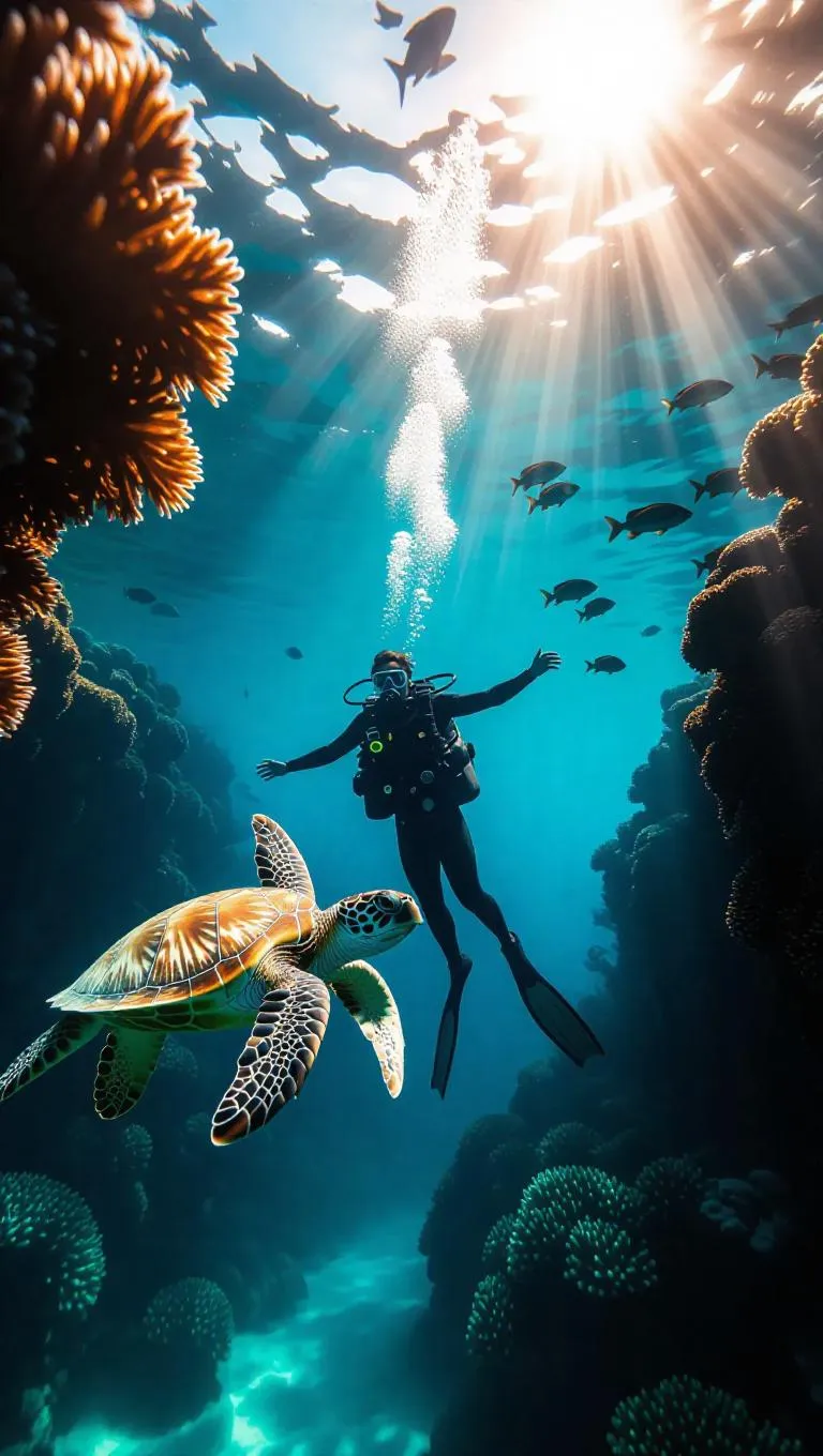 Top-down view of diver hugging a sea turtle near a vibrant coral reef, schools of seahorses gliding gracefully, sunlight streaming through a transparent glass corridor, creating an enchanting underwater world.