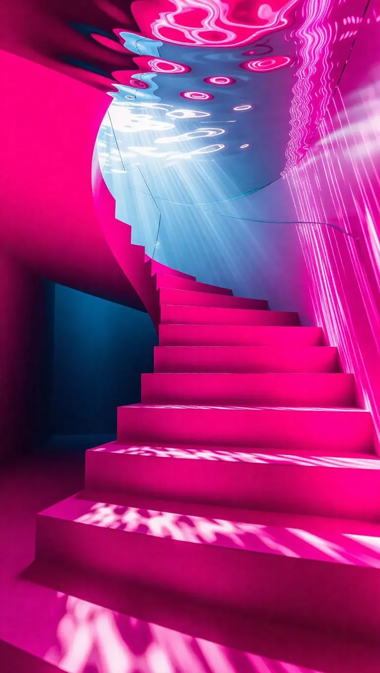 A vibrant underwater staircase spiraling upward, infused with pink surface light, dynamic lines, lively atmosphere, surrounded by swirling waters and shining water.