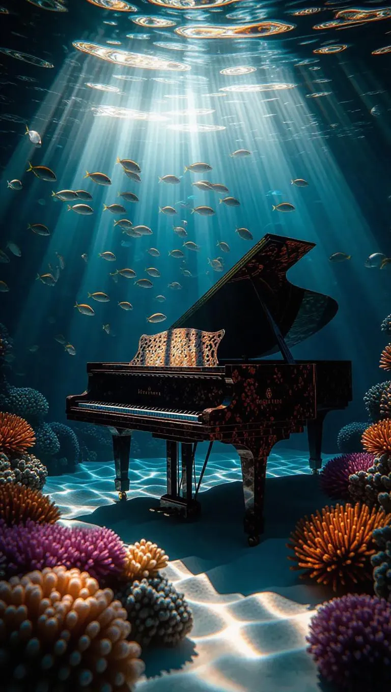 A surreal underwater scene of an ancient piano half-buried in coral, sunlight streaming down, creating a mesmerizing play of light and shadow, divine lighting, highly detailed, surrounded by swirling schools of colorful reef fish.