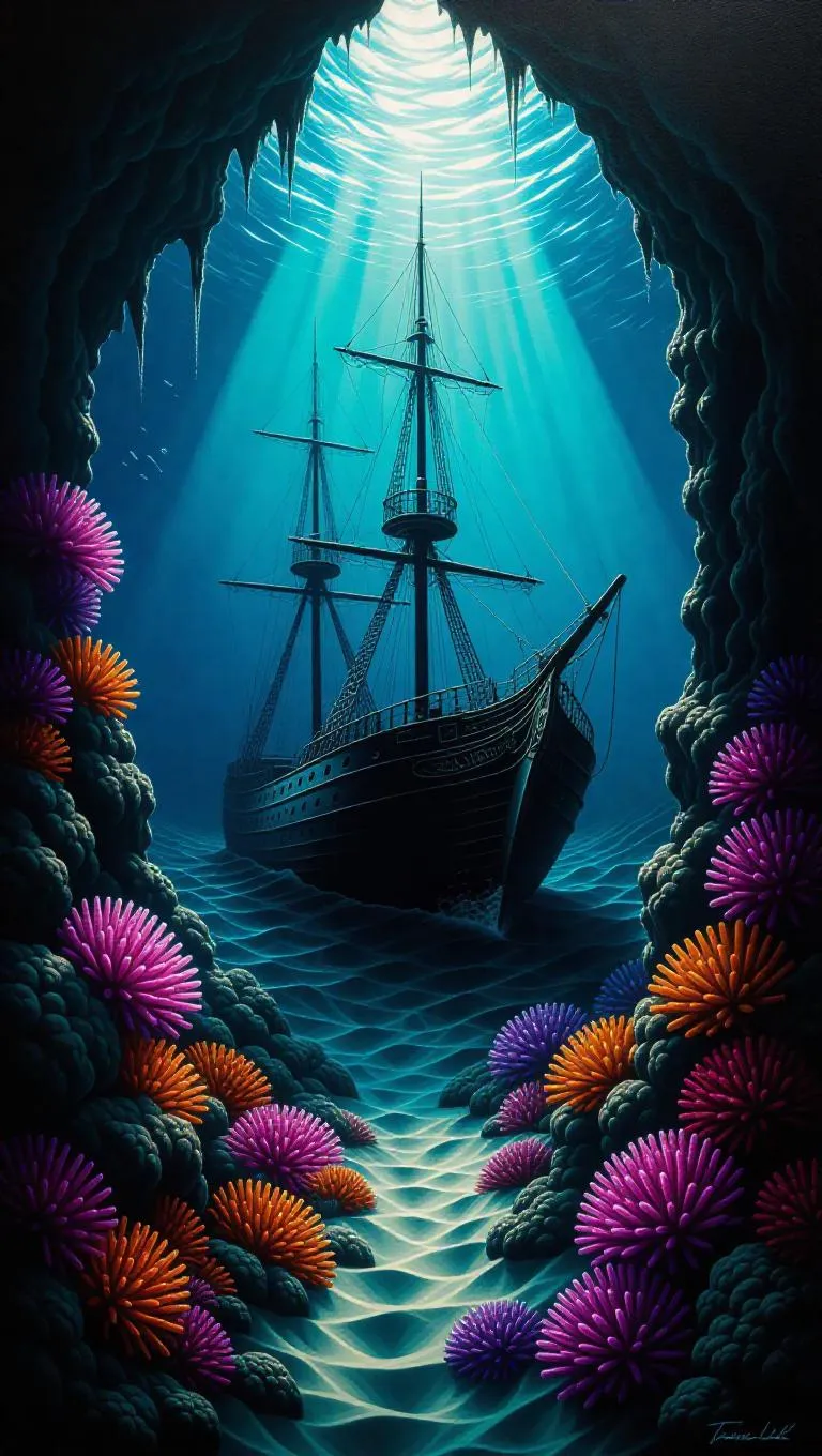 Oil painting of a shipwreck split in two, illuminated by vibrant corals, rich textures, dramatic shadows, and swirling underwater currents, creating a hauntingly beautiful scene.
