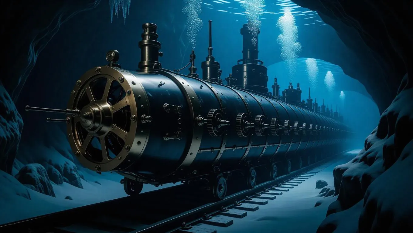 Dutch angle shot of a Victorian submarine traversing through frozen underwater caves, brass gears rotating amidst ice formations, air bubbles rising from silver bolts, oil-painting style with frost effect, eerie underwater lighting, complex mechanical details, bioluminescent creatures.