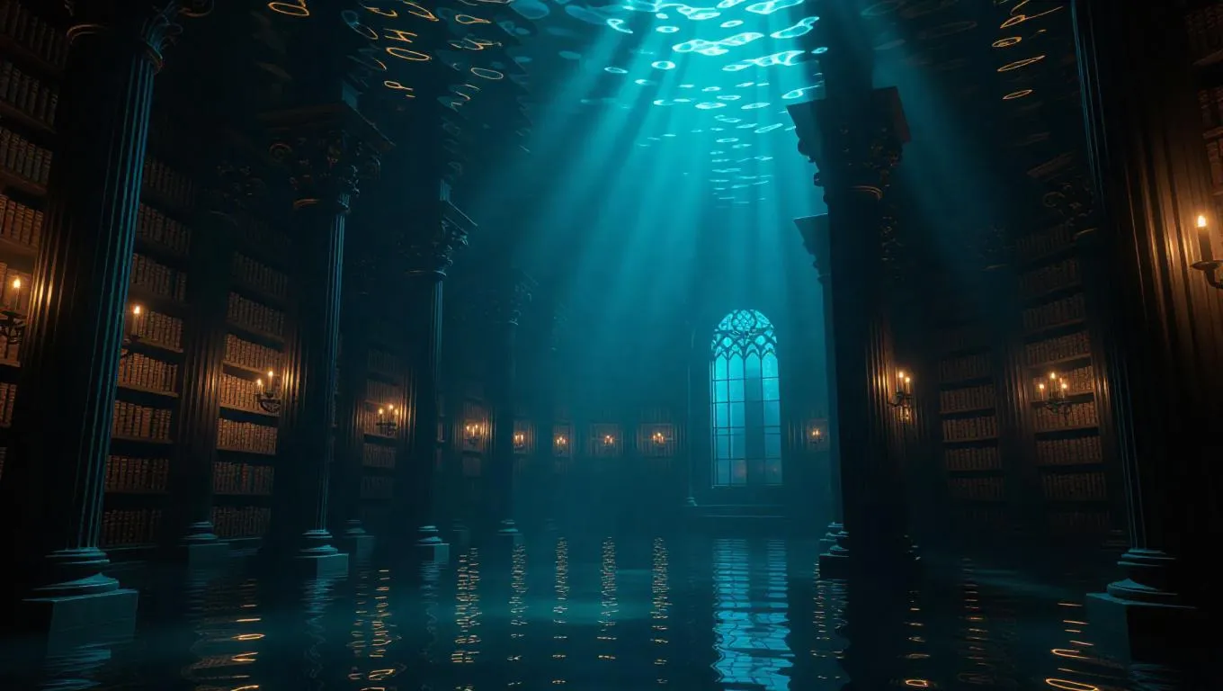 A grand underwater library with wooden columns adorned with bioluminescent algae, where old tomes hover in the tranquil waters. Starlight shines from the surface above, casting playful light shapes on researching merfolk scholars.