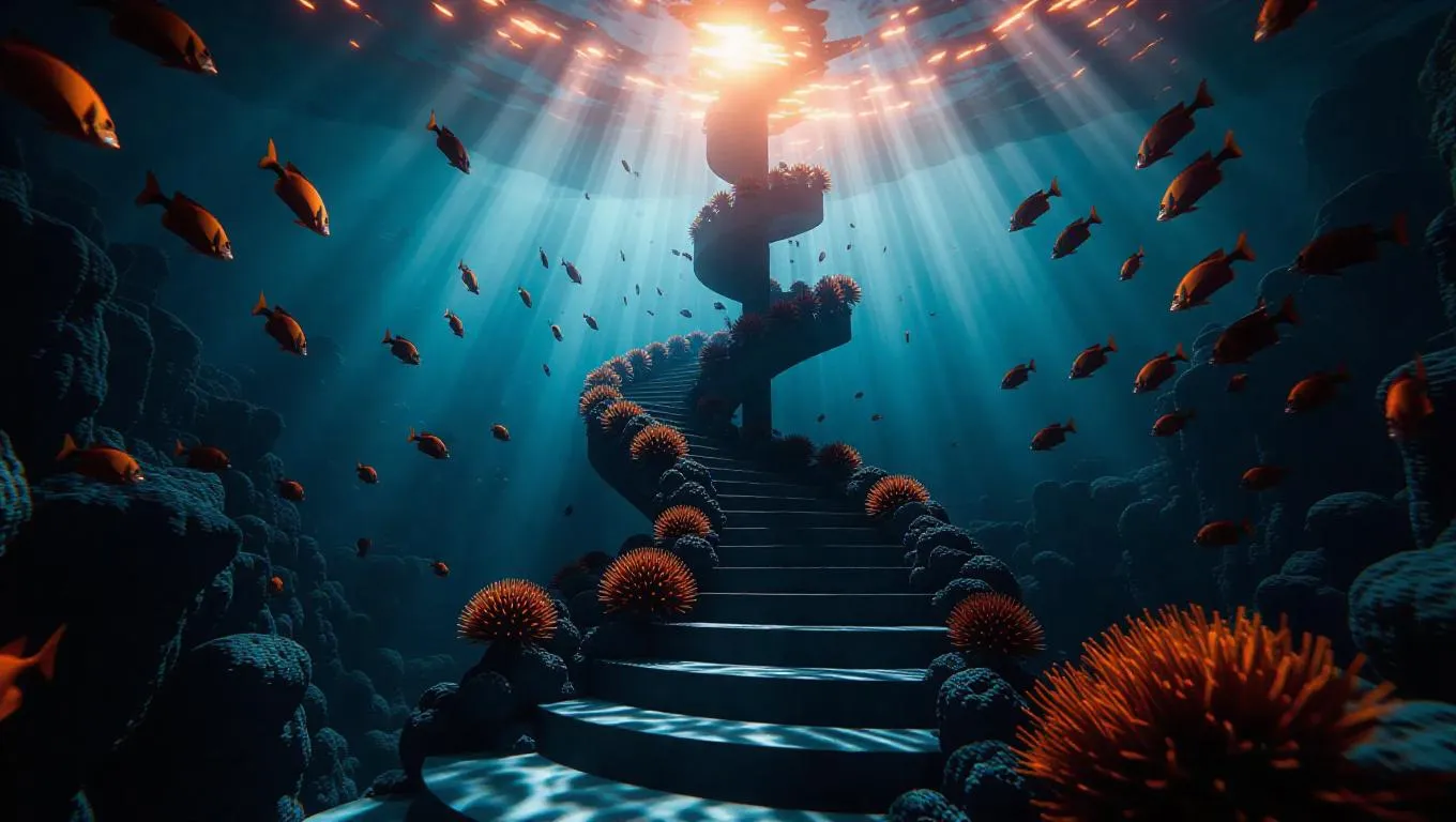 A surreal underwater palace spiraling upward, bathed in vibrant surface light, elegant lines, mystical atmosphere, surrounded by swift currents and shining water, with bioluminescent fish and fiery seaweed adding a magical glow.