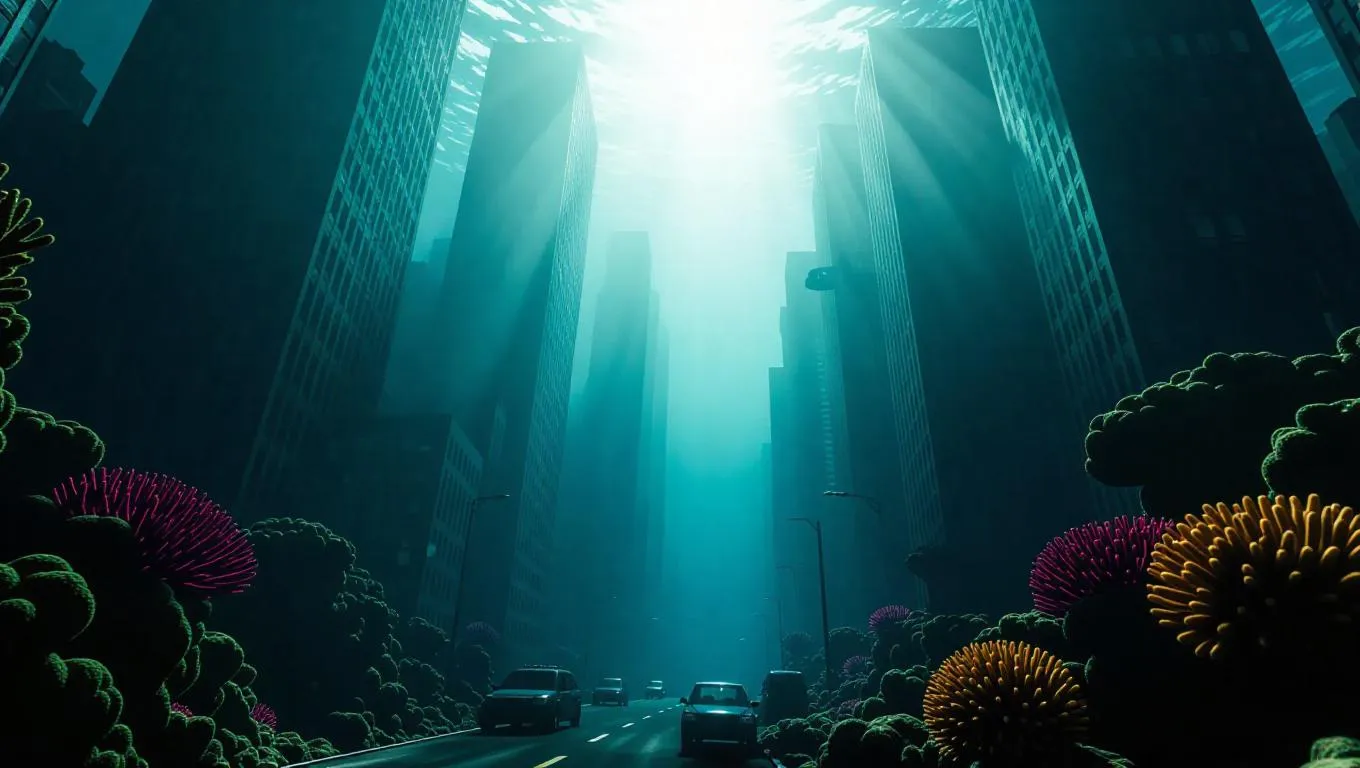 A cityscape scene underwater, submerged skyscrapers and streets, sunlight filtering through the seaweed, creating a haunting play of light and shadow, cinematic lighting, highly detailed, surrounded by colorful coral reefs.