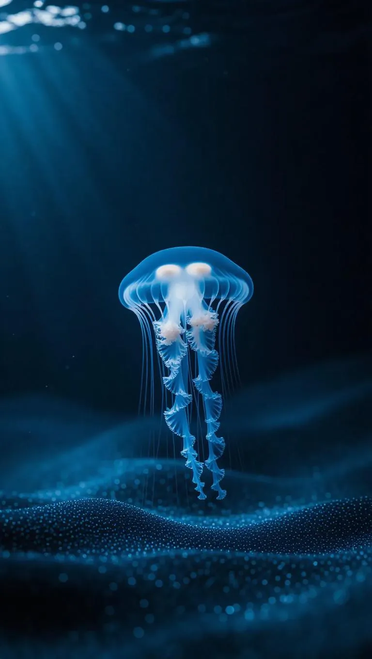 Minimalist underwater scene, a single jellyfish gracefully centered in sea blue waters, soft gradients transitioning from dark to light, clean and elegant lines, ethereal glow.