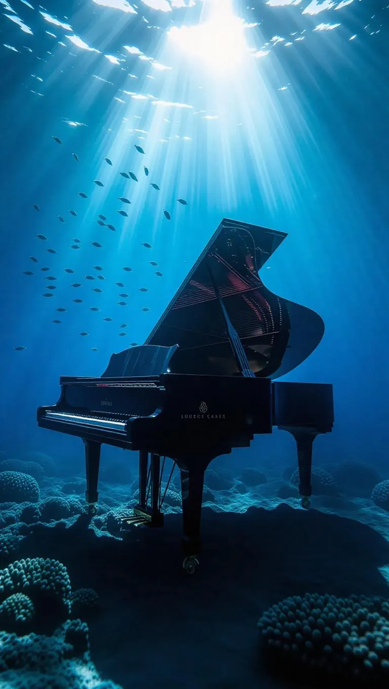 A surreal underwater scene of a harpsichord gently sinking into the deep blue sea, rays of underwater light piercing through, creating a mesmerizing play of light and shadow, cinematic lighting, highly detailed, surrounded by swirling clouds of tiny fish.