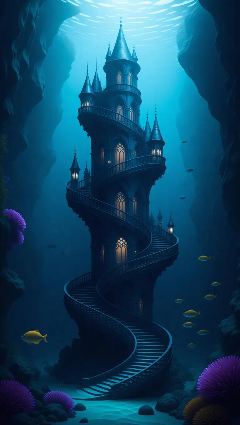 A surreal underwater chateau spiraling upward, immersed in twilight surface light, soft lines, ethereal atmosphere, surrounded by gentle currents and misty water, with bioluminescent fish and vibrant corals adding a magical glow.
