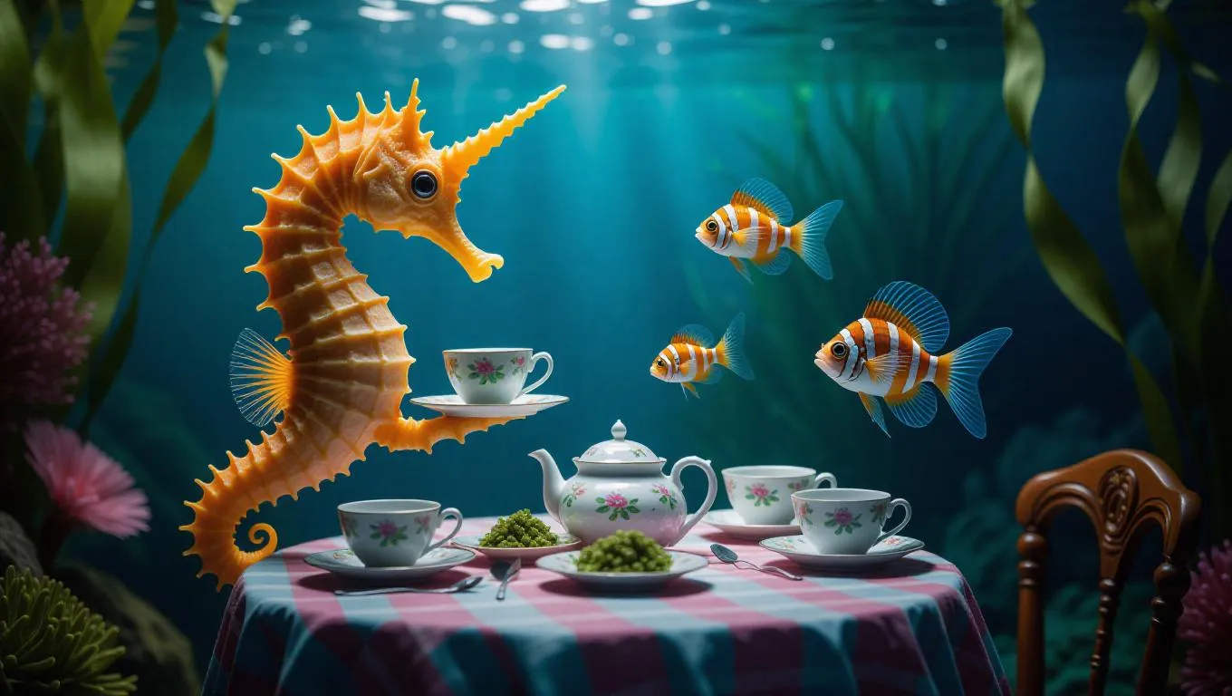 A magical underwater tea party hosted by a seahorse, with its tail holding teacups and plates of seaweed snacks. A shrimp plays the role of the butler, while a damselfish and a neon tetra enjoy the treats.