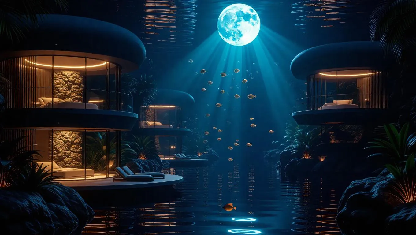 A futuristic scene underwater, with submerged luxury villas and advanced technology, rays of moonlight soaring through, creating a mesmerizing play of light and shadow, romantic lighting, highly detailed, surrounded by inviting tropical fish.