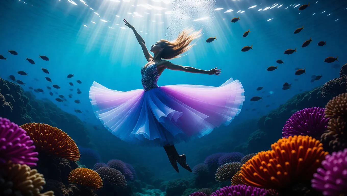 Surreal underwater ballet dancer, composed of shimmering water and radiant light, gracefully gliding through a vibrant, coral-filled sea, surrounded by tiny fish, creating a mesmerizing dance of colors and motion.