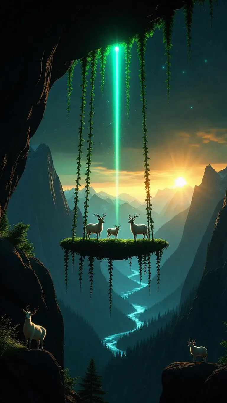 Soft-focused fantasy scene, a swing made of vines hanging from a giant mountain peak, glowing stars twinkling in the sky, ethereal light beams piercing through the valleys, creating a magical ambiance, vibrant mountain goats climbing around.