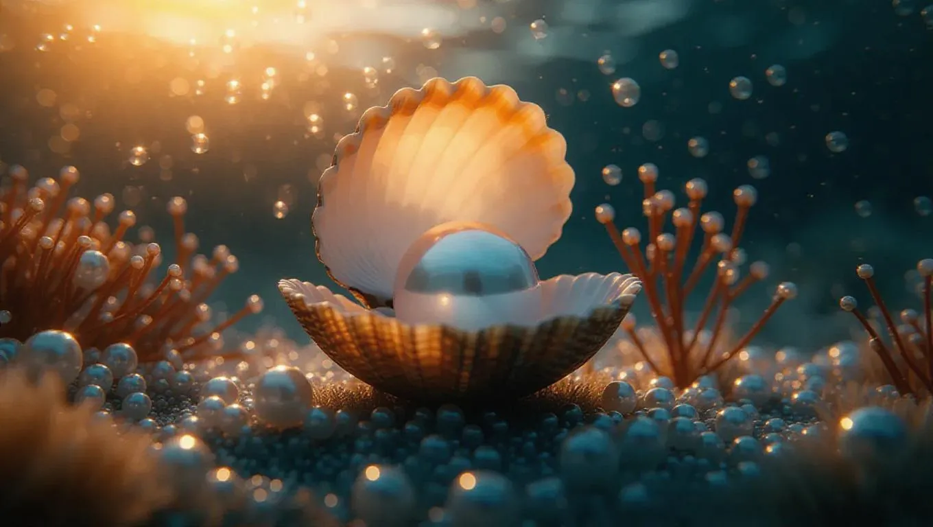 Minimalist underwater scene of a lustrous pearl nestled in an open clam, surrounded by perfect symmetry and soft, mesmerizing light reflections, creating a serene and tranquil ambiance.
