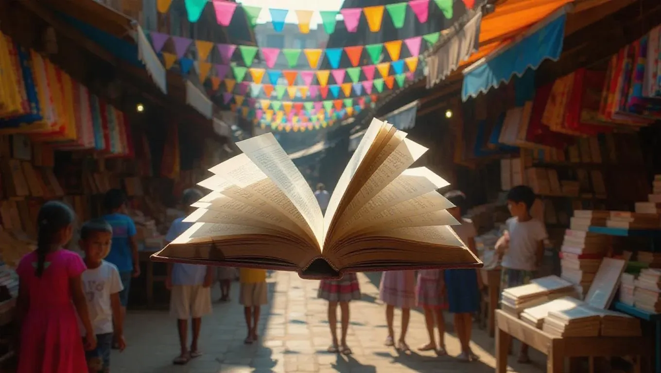 A floating bookshelf in a vibrant marketplace, pages of open books fluttering like ethereal spirits, surrounded by colorful stalls and laughing children, creating a festive and cheerful atmosphere.